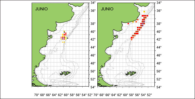 Particularmente, respecto a junio, la faena se concentró sobre la plataforma intermedia, entre 41°S y 43°S. En el área, 50 buques pescaron 8.658 toneladas (16,6 t./día); es decir, comenzó a mermar la disponibilidad del recurso respecto del promedio general.