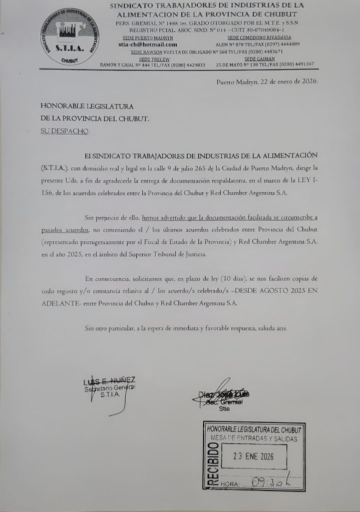El conflicto en torno a la ex Alpesca sumó un nuevo capítulo institucional que forma parte de un telenovela mediática más que la realidad de los sucesos reales. El Sindicato Trabajadores de Industrias de la Alimentación (STIA) formalizó ante la Honorable Legislatura del Chubut un nuevo pedido para acceder a la documentación completa de los acuerdos celebrados entre la Provincia y Red Chamber Argentina S.A., amparándose en la Ley I-156 de acceso a la información pública.