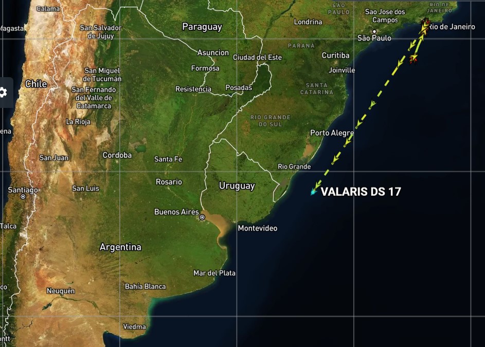 Tal lo anticipado al gobierno nacional oportunamente, ahora sí el buque Valaris DS-17, puso proa hacia el Area CAN-100, donde tiene previsto arribar el día miércoles a primera hora de la mañana, despues de haber zarpado desde la rada de Río de Janeiro en Brasil hace 48hs.donde estaba operando en la cuenca de Bacalhau en aguas cercanas a la costa carioca, para la empresa Petrobras de extensa participación en la explotación offshore de aquel país.