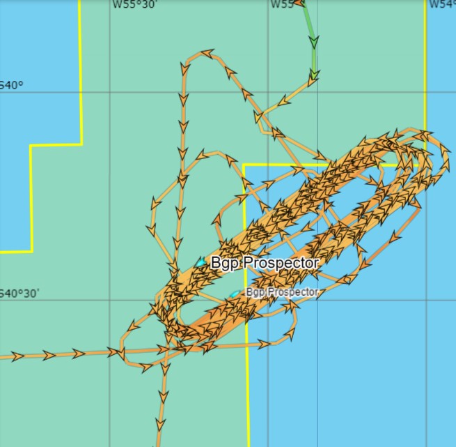 Mientras tanto desde la zona de operaciones CAN-108, la actividad se desarrolla como lo planificado, sin novedades, relevando el perfil del subfondo marino, en sentido SW-NE formando un circuito «olímpico» típico de operaciones compatibles con el relevamiento sísmico del BGP Prospector , que desde que llegó, permanece con un derrotero de trabajo en la zona Noroeste de CAN-108, como se detalla en la figura.