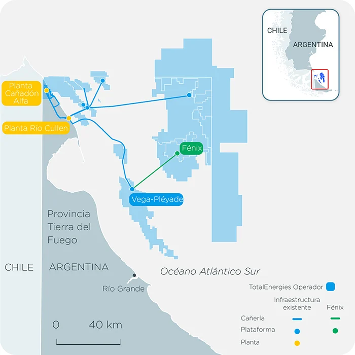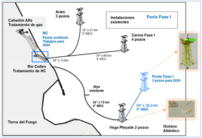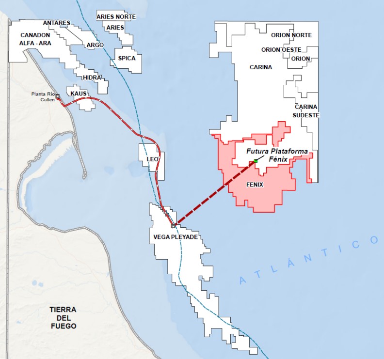 El desarrollo gasífero de Fénix, está integrado por el consorcio entre la empresa alemana Wintershall DEA,(37.5%) Pan American Energy (PAE 20%) y Total Austral (42.5%), la subsidiaria local de la francesa Total Energies. El siguiente paso está programado para la interconexión entre tres pozos y la propia red de tubos que el gigante Castorone tendió hace 3 meses, para intercomunicar el gas de Fénix con la plataforma ya operativa, Vega Pléyade.