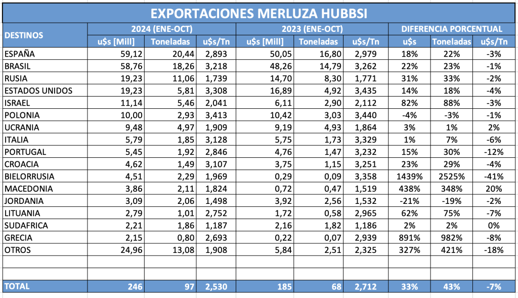 Las exportaciones de merluza Hubbsi según el INDEC, evidencian un panorama mixto en el período comprendido entre enero y octubre de 2024, con un notable aumento en los volúmenes enviados que contrarresta parcialmente la caída generalizada de los precios por tonelada. Este escenario pone de relieve la necesidad de adaptarse a un mercado global en constante transformación, donde las variaciones de la demanda y las condiciones económicas generan tensiones en los valores comerciales.