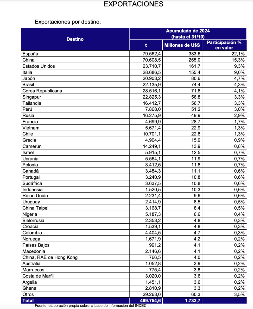 En segundo lugar, China se posiciona como un socio estratégico, al recibir 70.608,5 toneladas por 265,0 millones de dólares, equivalentes al 15,3% del valor total exportado. La creciente demanda china subraya la importancia de este mercado asiático para el comercio pesquero argentino, especialmente en productos de alta demanda y valor agregado.