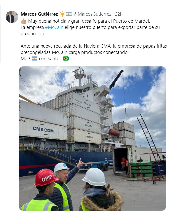 Además del compromiso de Lamb Weston, la mayor productora mundial de papas preelaboradas con base en el Parque Industrial Gral.Savio de la localidad de Batán; con beneplácito ayer, el propio presidente del Consorcio, informó que Mc Cain Foods, siendo la marca número 1 de papas congeladas en el mundo de origen canadiense también utilizará la terminal portuaria de Mar del Plata con destino exportación por vía marítima.