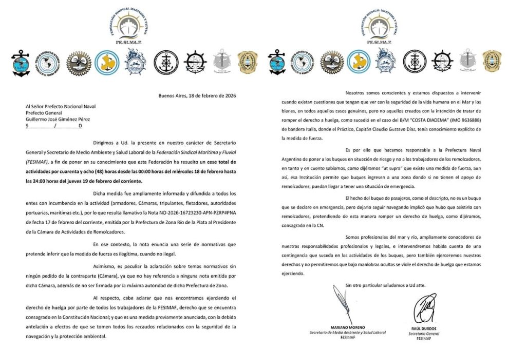 El comunicado, fechado el 18 de febrero en Buenos Aires y dirigido al Prefecto Nacional Naval, Prefecto General Guillermo José Giménez Pérez, informa que la Federación resolvió un paro total desde las 00:00 del miércoles 18 hasta las 24:00 del jueves 19 de febrero.