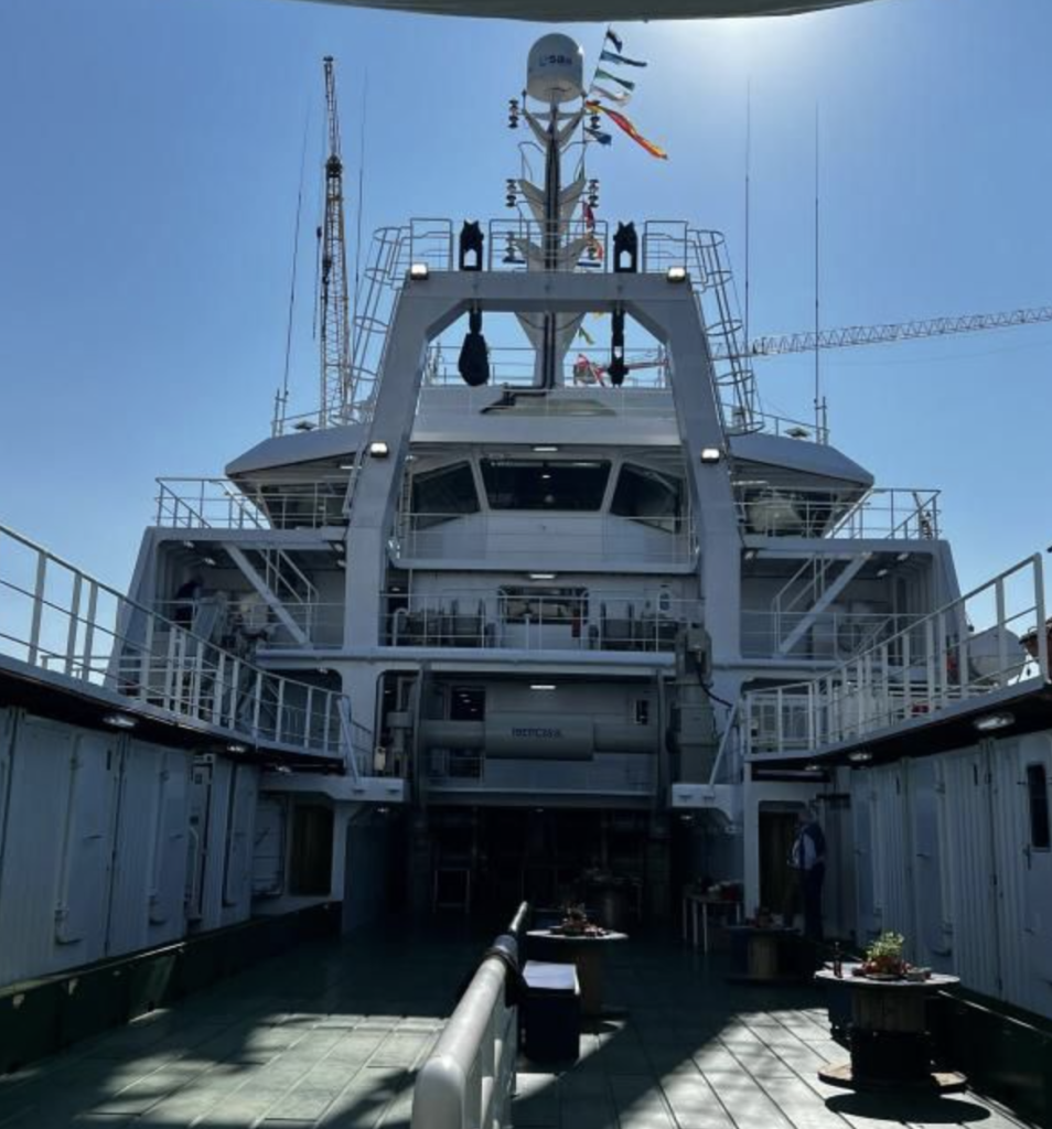Detalle: minutos antes de la ceremonia de Bautismo de Mar, el Hadassa Bay exhibe bandera de España y de Falklands Is.