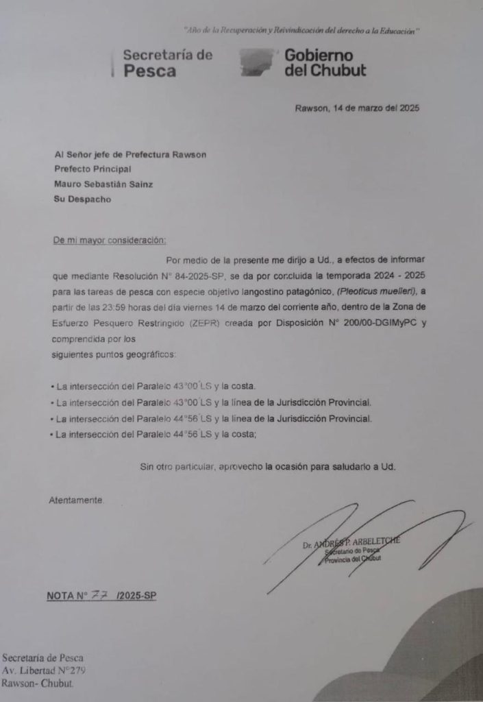 La disposición, firmada por el secretario de Pesca del Chubut, Dr. Andrés Arbeletche, se enmarca en la gestión sostenible del recurso y la regulación del esfuerzo pesquero en aguas provinciales. Esta medida es clave para garantizar la conservación de la especie y el mantenimiento de la actividad en futuras temporadas, aunque generó algunas quejas de una parcialidad que aun consideraba que las condiciones biológicas del recurso eran optimas para la continuidad de las operaciones de pesca-