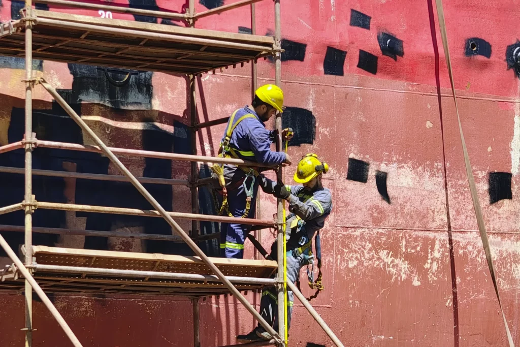 En cuanto al carenado, el equipo ejecutó una limpieza integral utilizando hidrojetting y barrido, con énfasis en las áreas viva y muerta del casco. Posteriormente, se aplicó un esquema de pintura triple en estas áreas, además de renovar las marcas de calado, francobordo y los nombres del buque. Además, se realizaron tareas de limpieza en los tanques de combustible, aceite de lubricación, lastre y en las cajas de cadenas.