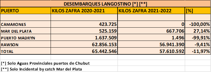 Sin mayores datos de los últimos dias -por el momento- los valores aproximados al 15 de marzo arrojaban una captura de casi 57.000Tn para el puerto de Rawson respecto a 62.856Tn de la zafra anterior, con una merma del -9.41%; lo que sitúa igualmente como una buena temporada para Chubut, que en definitiva permitió la continuidad de trabajo en el sector industrial procesador sin grandes tapones en los ingresos, en el fondo, permitiendo una mayor calidad de marisco.