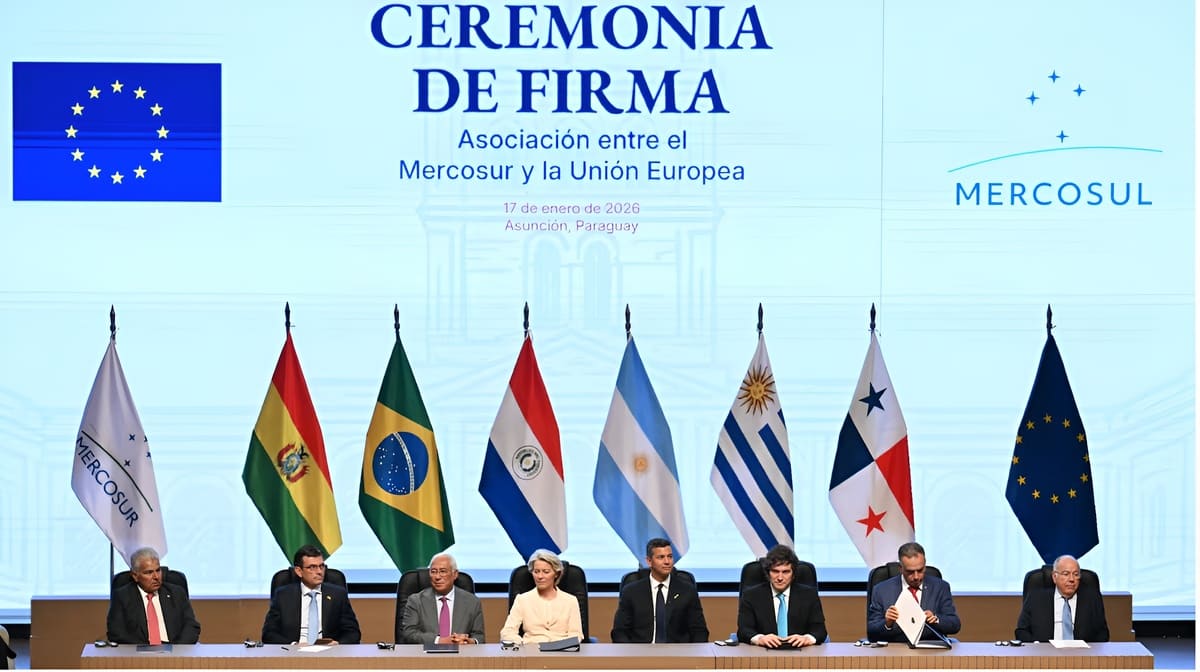 El acuerdo de libre comercio entre el Mercosur y la Unión Europea fue firmado formalmente este sábado 17 de enero al mediodía en el Gran Teatro José Asunción Flores, en Asunción. El acto contó con la participación del presidente Javier Milei, quien viajó a Paraguay para acompañar una rúbrica que marca un nuevo capítulo en la relación comercial entre ambos bloques.