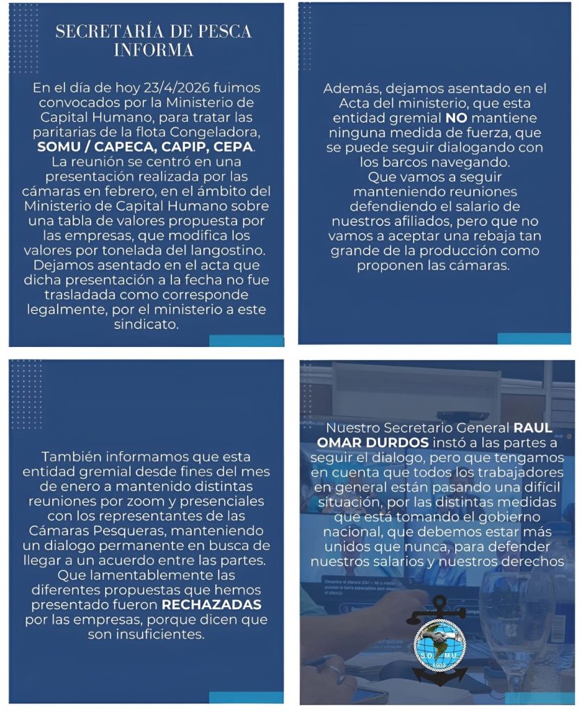 En este marco, apenas conocida la resultante de esa cumbre, la secretaría de pesca del SOMU informó a sus afiliados: