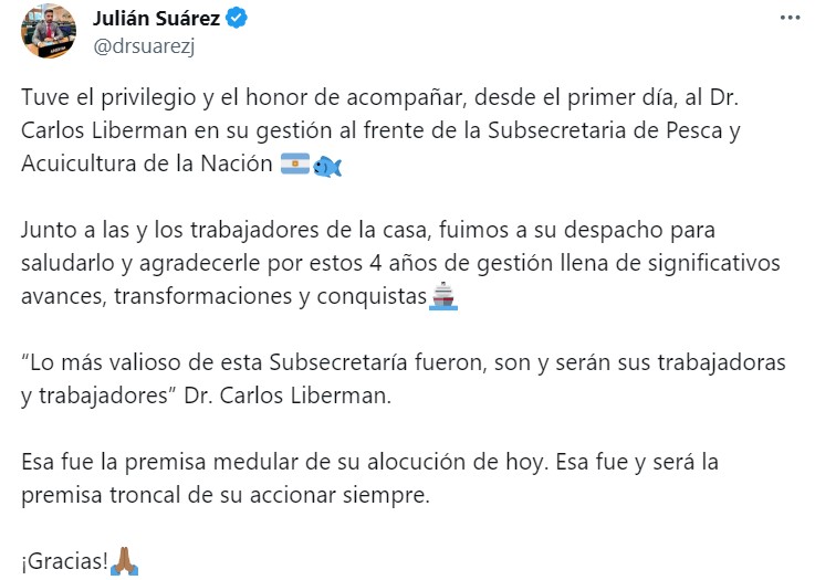 Pasado el mediodía de hoy, todos los cuadros del sector pesca de la Subsecretaría de Pesca y Agricultura de la Nación y organismos dependientes, como Dirección Nacional de Control y Fiscalización Pesquera, y Dirección de Coordinación (aunque la Lic. Gabriela Navarro no pudo estar presente en la reunión), fueron recibidos para un último encuentro en el propio despacho del sorprendido Subsecretario Dr. Carlos D. Liberman, quien abrumado hasta el punto de la emoción, dirigió unas sentidas palabras dejando como premisa que “Lo más valioso de esta Subsecretaría fueron, son y serán sus trabajadoras y trabajadores”, quienes en un cerrado aplauso concluyeron el emotivo acto. Así, su Director, lo expresó en la red social X: