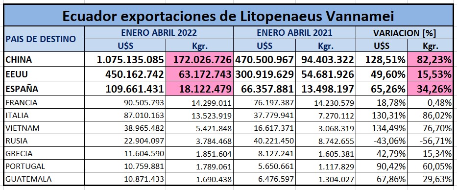 Cuando observamos las importaciones de langostinos a esos países, se detecta que tanto China, Estados Unidos y España, (este último en menor volumen y medida) han importado desde Ecuador volúmenes muy importantes del langostino de cultivo Litopenaeus Vannamei, comúnmente llamado en la jerga Vannamei.