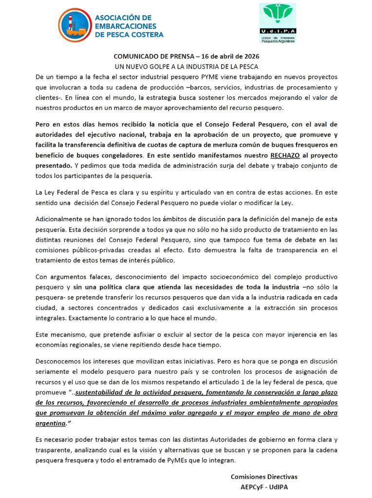 En la misma línea, la Asociación de Embarcaciones de Pesca Costera y Fresquera (AEPCyF) y la Unión de Intereses Pesqueros Argentinos (UdIPA) cuestionaron el mecanismo propuesto al considerar que promueve una transferencia de recursos que afecta a la industria radicada en tierra y se aleja de los principios establecidos en la Ley Federal de Pesca.