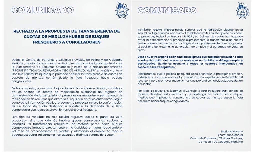 Desde la organización advirtieron que un esquema de transferencia estructural de cuotas hacia la flota congeladora podría afectar el equilibrio entre flotas y reducir la actividad en tierra, con consecuencias sobre el empleo en toda la cadena pesquera. Asimismo, reclamaron que cualquier discusión sobre la administración del recurso se realice en un ámbito de diálogo amplio que incluya a todos los sectores involucrados.