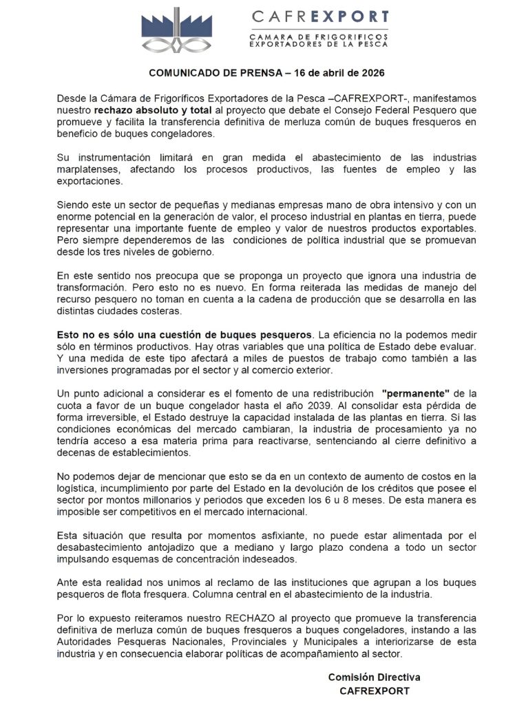 Desde la Cámara de Frigoríficos Exportadores de la Pesca (CAFREXPORT) señalaron un rechazo “absoluto y total” a la iniciativa, al advertir que su implementación podría limitar el abastecimiento de las plantas de procesamiento, con impacto directo sobre la producción, el empleo y las exportaciones.