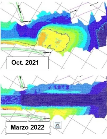 La imagen que acompaña esta nota permite una comparación entre la delicada situación que se vivía previamente al inicio del dragado, con presencia del banco de arena en la Escollera Sur. La imagen refleja en los tonos de color amarillo y verde, las consecuencias a la fecha y en color azul las mayores profundidades.