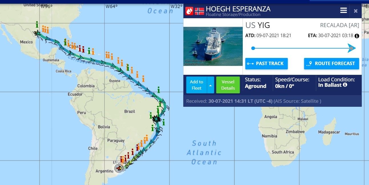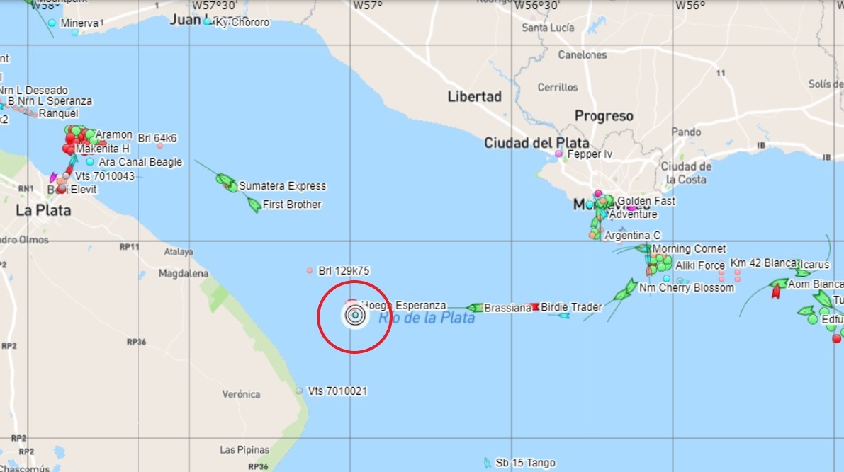 Con motivo del intenso trabajo realizado por el remolcador MADRUGADOR de 2500HP y aprovechando la pleamar, el gigante buque gasero Hoegh Esperanza, pudo comenzar a navegar por sus propios medios, y a partir de las 1840hs dejo atrás la fatídica baliza BRL-143 KM90 del Canal artificial Punta Indio. Se estima en la mañana, estará en recalada La Plata para completar su descarga a la brevedad. Mientras tanto es escoltado por los guardacostas GC-75 Bahía Blanca y GC-73 Cabo Corrientes. En tanto, el poderoso remolcador Ranquel, se acercaba al lugar con sus 4500HP, aunque no hizo falta y nuevamente puso proa a puerto, a escasas 9 millas náuticas del lugar.