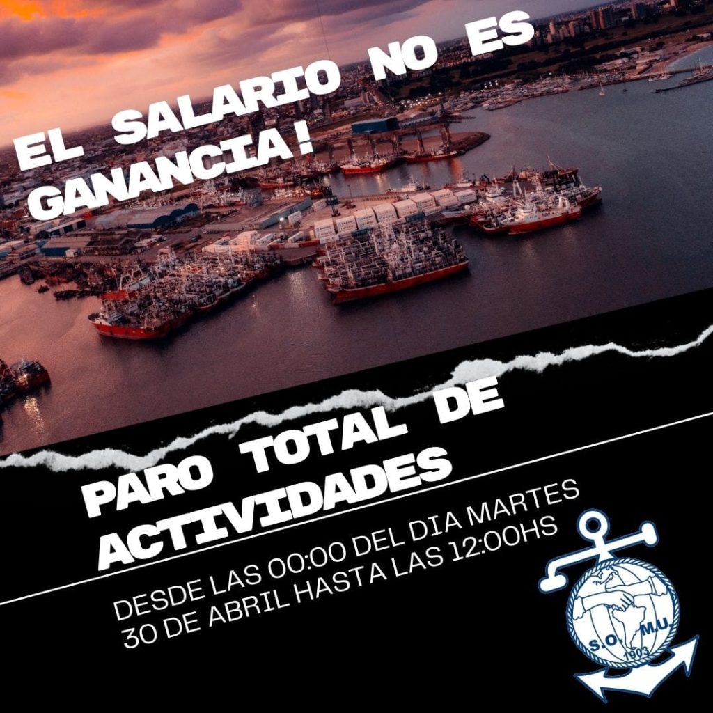 El comunicado que lleva la anuencia de SOMU, SICONARA y Centro de Patrones a nivel nacional, indica que “asimismo a partir de las 18 hs. del día de hoy, 29 de abril de 2024 y hasta las 12 hs. del día 30 de abril, se realizará un cese total de actividades con permanencia a bordo y atendiendo únicamente las emergencias, en los sectores de Remolque de Maniobra Portuaria, lanchas de amarre y lanchas de Practicaje para el embarque de Prácticos, realizándose exclusivamente los servicios para desembarcar a los mismos.”