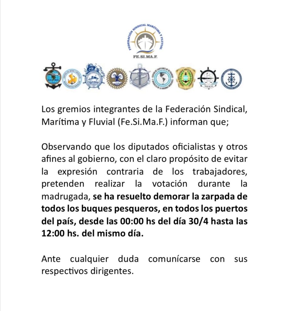 “Como inicio de un plan de lucha en la actividad marítima, fluvial y de Pesca, contra la iniciativa del Gobierno Nacional de realizar una modificación en el régimen de Ganancias, el cual entre otras cosas, eliminarían el capítulo de las exenciones a la Cuarta Categoría y avanzarían con una reforma laboral, es que nos declaramos en Estado de Alerta y Movilización”, expresaron.