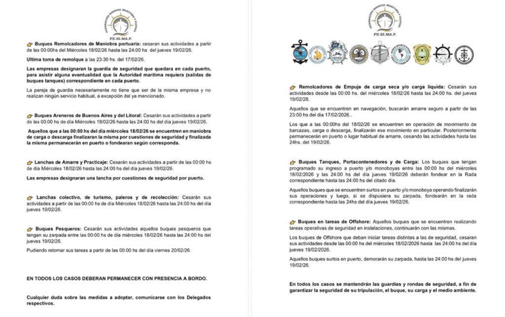Asimismo, en una clara prioridad de continuidad a la operativa que los buques venían desarrollando, la entidad menciona: “Aquellos que a las 00:00 hs del miércoles 18/02/26 se encuentren en maniobra de carga o descarga finalizarán la misma por cuestiones de seguridad y luego permanecerán en puerto o fondearán según corresponda”.
