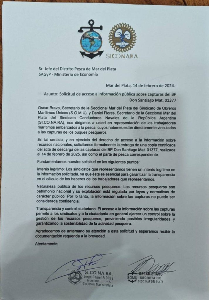 En el escrito, fechado el 14 de febrero de 2025, Oscar Bravo, secretario de la seccional Mar del Plata del SOMU, y Daniel Flores, secretario de la seccional Mar del Plata del SICONARA, solicitaron la entrega de una copia certificada del acta de descarga y del parte de pesca correspondiente a la captura realizada en la misma fecha.