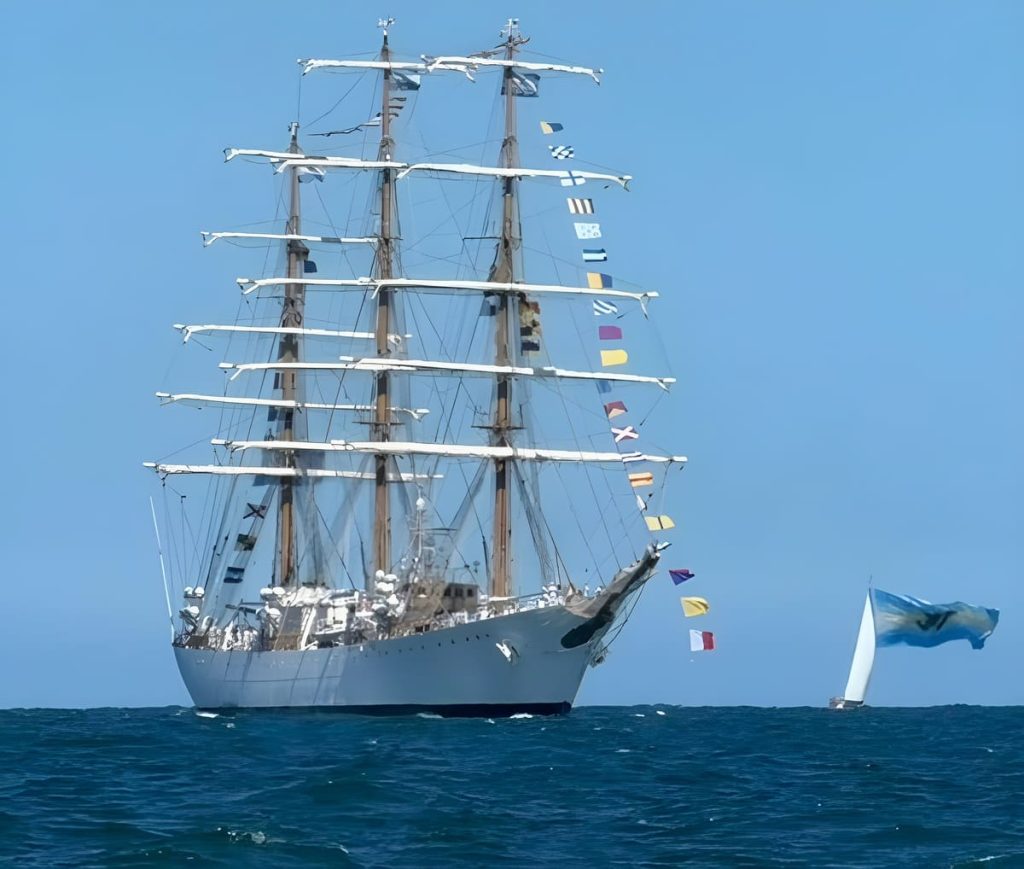 En su ingreso, la fragata presentó cuatro gavieros, los únicos posibles en esas condiciones, afirmados en el bauprés, engalanando la ya empavesada silueta del buque escuela. Fue un detalle técnico para los entendidos y, al mismo tiempo, un gesto profundamente humano para el resto, la confirmación de que, incluso en su ceremonial, el mar siempre impone respeto.