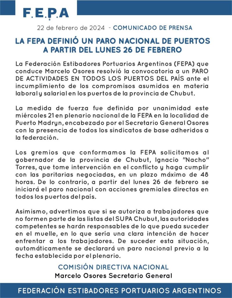 El comunicado también expresa que “los gremios que conformamos la FEPA solicitamos al gobernador de la provincia de Chubut, Ignacio ‘Nacho’ Torres, que tome intervención en el conflicto y haga cumplir con las paritarias negociadas, en un plazo máximo de 48 horas. De lo contrario, a partir del lunes 26 de febrero se iniciará el paro nacional con acciones gremiales directas en todos los puertos del país.”