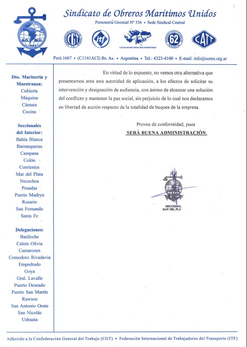 En un tramo de la denuncia indican que “en virtud de lo expuesto, no vemos otra alternativa que presentarnos ante esta autoridad de aplicación, a los efectos de solicitar su intervención y designación de audiencia, con ánimo de alcanzar una solución del conflicto y mantener la paz social, sin perjuicio de lo cual nos declaramos en libertad de acción respecto de la totalidad de buques de la empresa”.