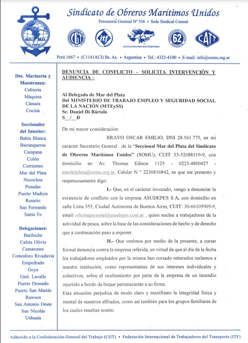 La denuncia dirigida al Delegado de la Agencia Territorial Mar del Plata de la Dirección Regional Pampeano de Ministerio de Trabajo, Empleo y Seguridad Social, Daniel Di Bártolo indica que por motivos de la existencia de un conflicto con la empresa “Asudepes S.A.” (así consta en la denuncia), la cual posee domicilio legal en la calle Lima 355 de la Ciudad Autónoma de Buenos Aires, realizaron la denuncia formal contra la empresa, ya que trabajadores nucleados en la misma, cursaron reiterados reclamos a la entidad gremial.
