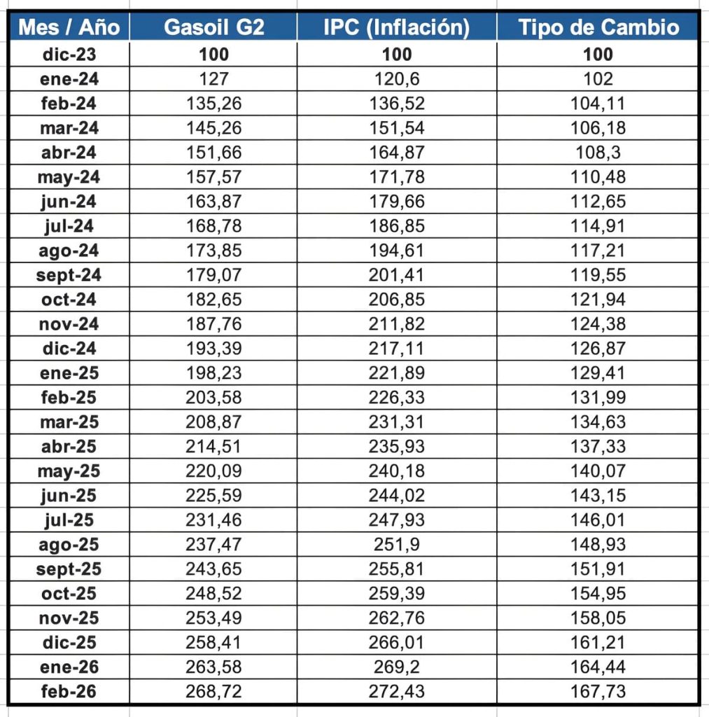 Gasoil vs. Dólar: El gasoil ha tenido una subida mucho más agresiva que el tipo de cambio oficial. Esto implica un encarecimiento en dólares del costo logístico en Argentina, ya que el precio del surtidor buscó cerrar la brecha con los valores internacionales mientras el dólar subía de forma controlada.