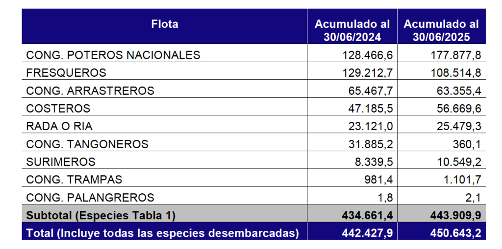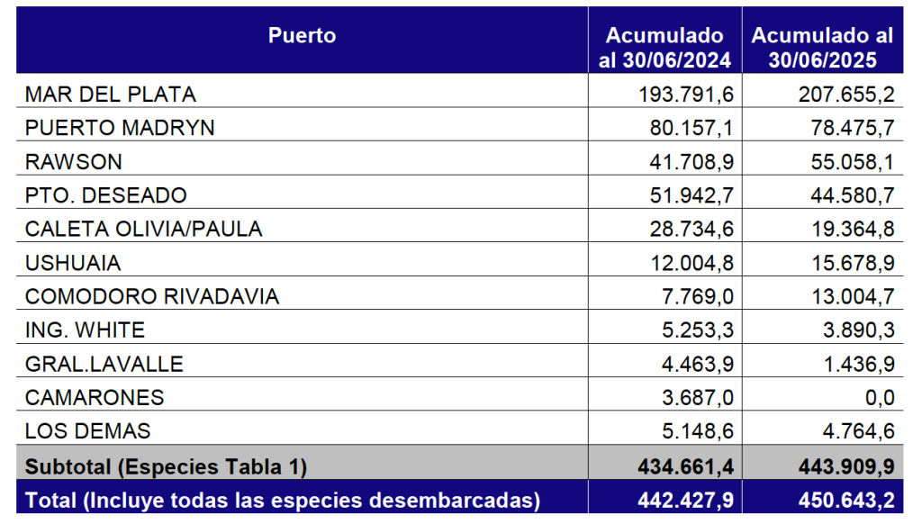 Según el informe, los desembarques acumulados al 30 de junio alcanzaron las 450.643 toneladas, frente a 442.428 en igual período del año pasado.