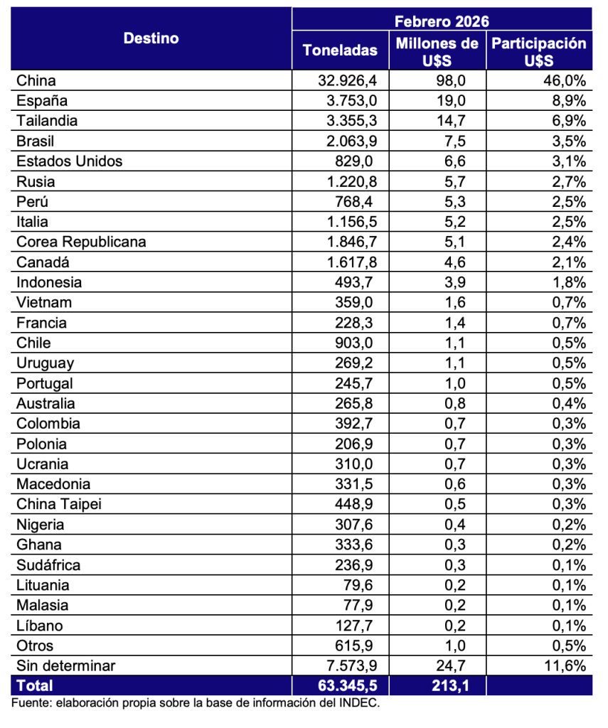 A esa segmentación productiva se suma la concentración comercial. En febrero, China absorbió USD 98 millones, equivalentes al 46% del valor exportado; en el primer bimestre concentró USD 141,6 millones, es decir, 36,8% del total. España quedó en segundo plano con USD 66,9 millones en el acumulado. La matriz exportadora sigue apoyada en pocos destinos y en pocos productos, una arquitectura que mejora el resultado cuando el ciclo acompaña, pero que al mismo tiempo expone a la actividad a una dependencia muy marcada de la demanda asiática y de la performance de un núcleo acotado de pesquerías.