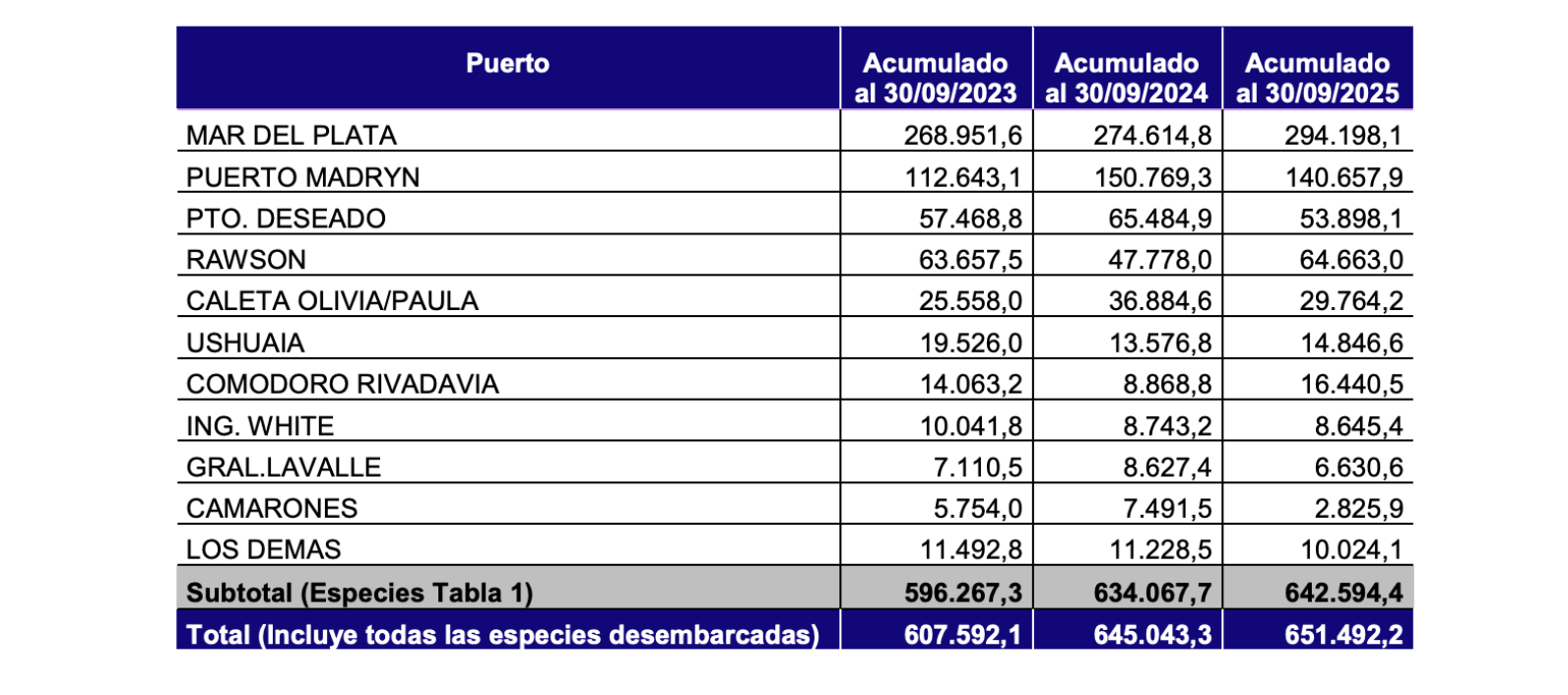 En el mapa de puertos, Mar del Plata se mantiene firme como el principal centro de desembarques, con 294.198 toneladas acumuladas al 30 de septiembre, un 7% más que en 2024.