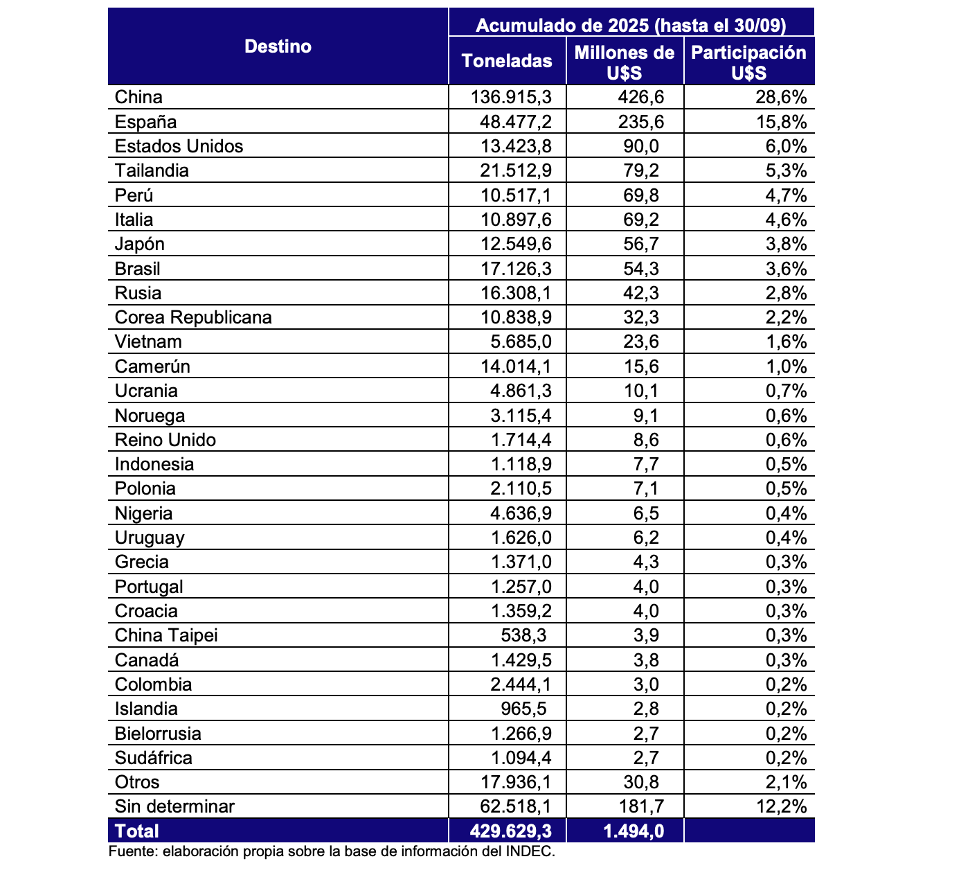 China continúa como principal destino anual acumulado, absorbiendo el 28,6% del total exportado, seguida por España (15,8%), Estados Unidos (6%) y Tailandia (5,3%).