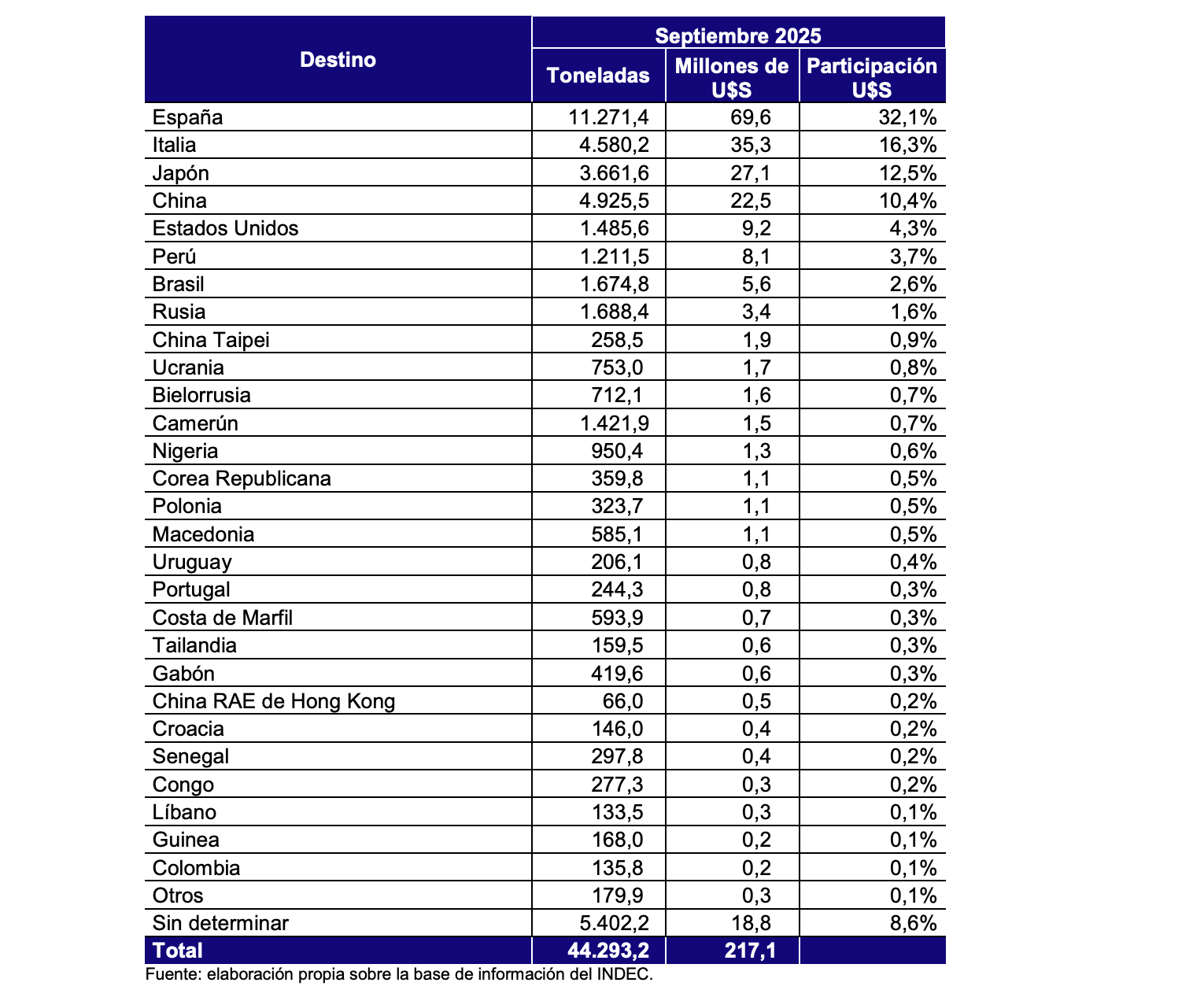 El rubro de crustáceos, dominado por el langostino, lideró el ingreso de divisas con 166,6 millones de dólares, seguido por los moluscos, que duplicaron sus valores respecto al año pasado. España, Italia, Japón y China fueron los principales destinos de las exportaciones totales en Septiembre 2025.