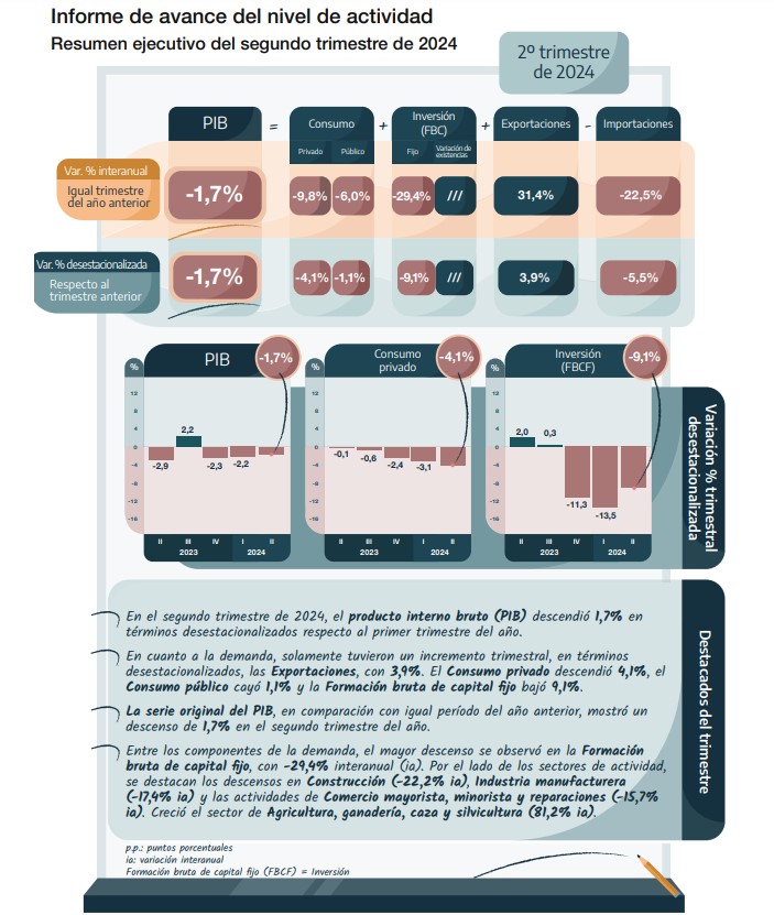 Durante el segundo trimestre de 2024, el Producto Interno Bruto (PIB) experimentó una contracción del 1,7% en términos desestacionalizados con respecto al trimestre anterior que fuera suministrado ayer por el INDEC mediante el Informe de avance del nivel general de la actividad del segundo trimestre de 2024 (Abr-May-Jun).