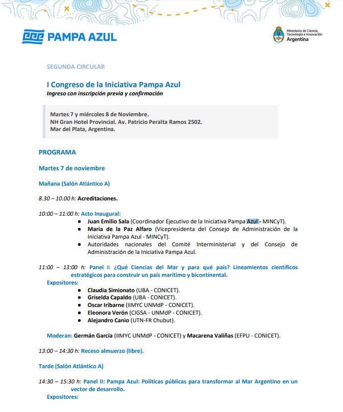 El cronograma indica que desde las 8:30 a las 10 se realizarán las acreditaciones, el acto inaugural a las 11, tras lo cual el Coordinador Ejecutivo de la Iniciativa Pampa Azul, Juan Emilio Sala, desarrolle la primera de las exposiciones.
