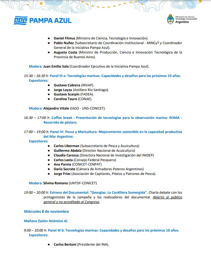 El día miércoles las actividades comenzarán a las 9 con el cuarto panel: “Políticas públicas para transformar el Mar Argentino en un vector de desarrollo, donde se destaca la presencia del Ministro de Ciencia, Tecnología e Innovación de la Nación Daniel Filmus, además de la concurrencia de Daniela Vilar (Ministra de Ambiente de la Provincia de Buenos Aires; Augusto Costa (Ministro de Producción, Ciencia e Innovación Tecnológica de la Provincia de Buenos Aires).