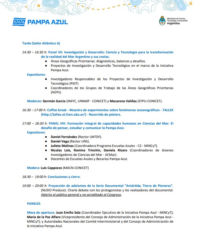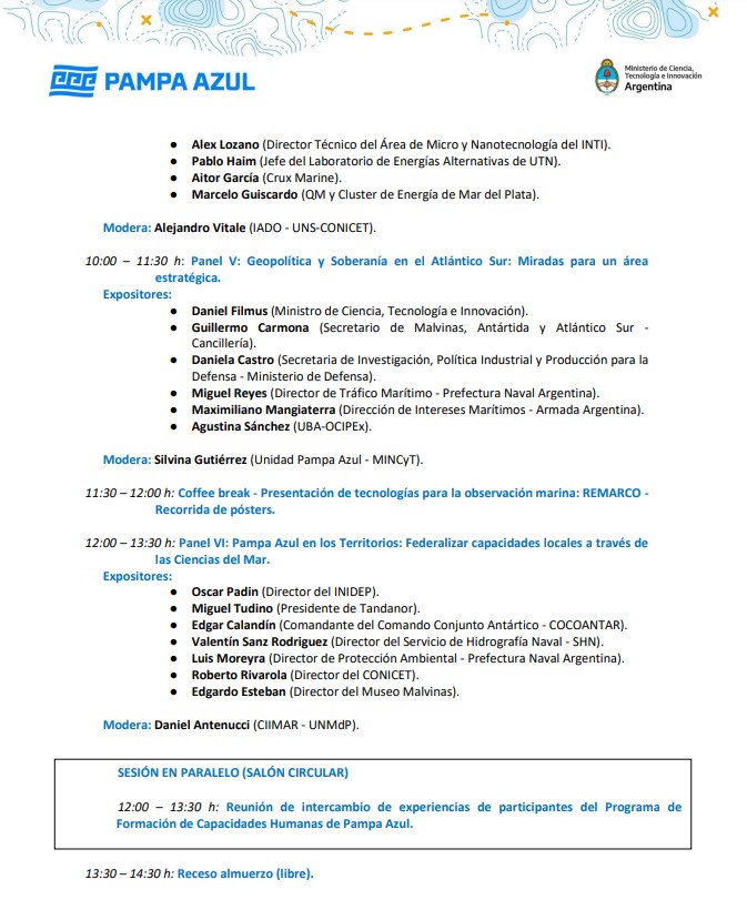 En el tramo denominado “Pampa Azul en los Territorios: Federalizar capacidades locales a través de las Ciencias del Mar. Expositores”, brindarán sus conocimientos entre otros el director del INIDEP Lic. Oscar H. Padín; Edgar Calandín (Comandante del Comando Conjunto Antártico – COCOANTAR) y Valentín Sanz Rodríguez (Director del Servicio de Hidrografía Naval – SHN).