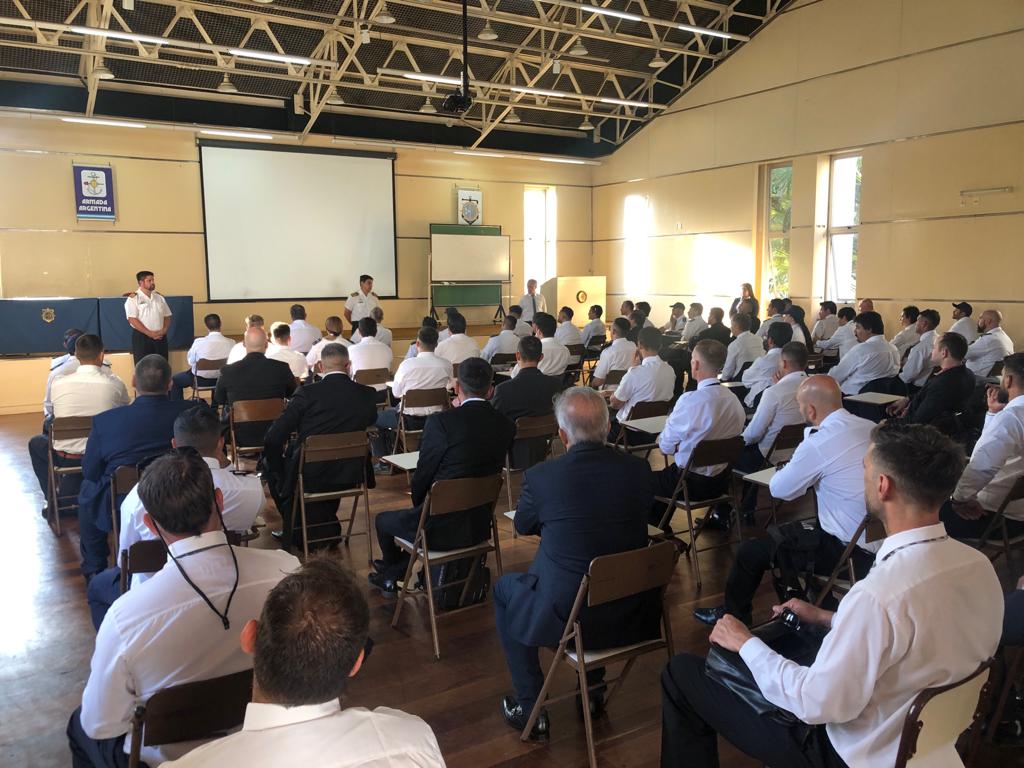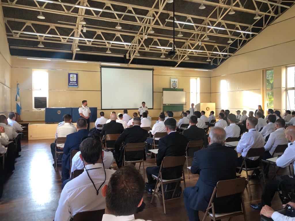 Acto seguido el propio director de la escuela Capitán de Navío Daniel Alberto Maldonado, el subdirector Capitán de Fragata Gastón Román Berón brindaron la bienvenida formal en el Aula Magna de la Escuela, a quienes les transmitieron los lineamientos que sigue la institución, el respeto y los valores, además de desearles un buen año lectivo y referirse a la nueva tecnicatura para los cursos del Área de Cubierta, recientemente aprobada.