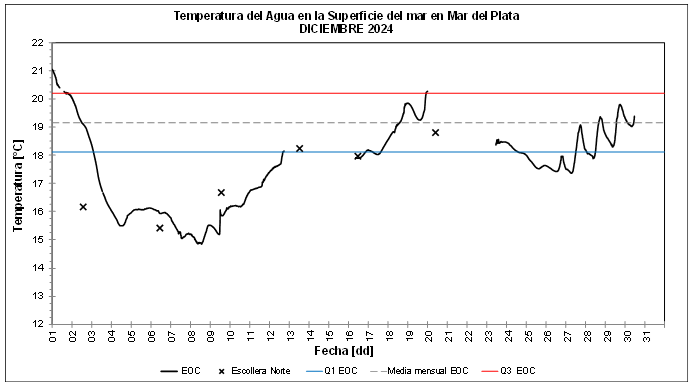 Según los datos recopilados por el Gabinete de Oceanografía Física del INIDEP, la temperatura promedio del agua en superficie durante diciembre fue de 17,5°C, un valor considerablemente inferior al promedio histórico para el mismo período. Este descenso térmico se produjo luego de un inicio de mes con temperaturas excepcionalmente altas, las cuales disminuyeron rápidamente en los primeros días de diciembre.