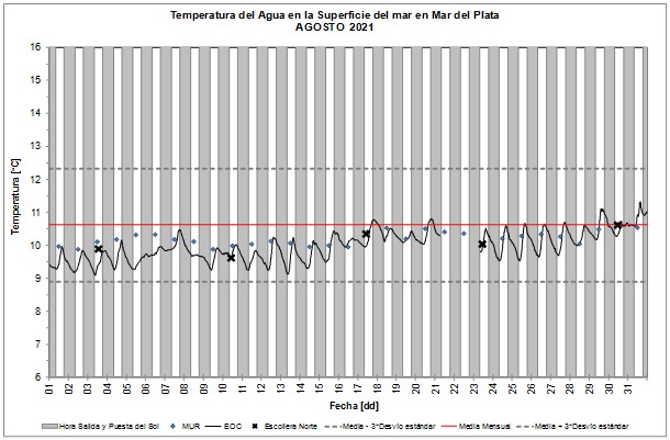 De acuerdo al faltante de esos dos días que mencionamos, para complementar la información correspondiente, el Instituto realizó estimaciones TSMsat que corresponden a la 4° versión del producto satelital MUR (Multi-scale Ultra-high Resolution), de acuerdo a lo informado técnicamente. De este modo observaron en el punto 38,00 °S y 57.53 °W la coherencia entre ambas series y que los valores de ese período no registrado, son los esperados para el sector en el mes de agosto.