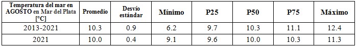 Más allá de estos detalles meramente técnicos, podemos decir que la temperatura del agua en la superficie durante el último mes de agosto, promedió los 9,97°C, con marcas diarias dentro del rango establecido para el mes en esa zona. Esta temperatura es inferior al promedio climatológico mensual correspondiente a la zona que es de 10,6°C.
