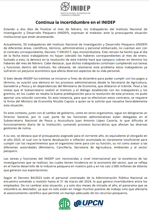 “Según el Decreto 84/2023 todo el personal contratado de la Administración Pública Nacional se encuentra sometido a revisión hasta el 31 de marzo del 2024, lo que genera incertidumbre entre los empleados. De no cambiar esta situación, y a solo dos meses de iniciado el año, el panorama que se vislumbra es desolador, ya que no solo están en riesgo muchos puestos de trabajo sino que afectaría el asesoramiento científico que permite un manejo adecuado de los recursos pesqueros”, concluye el comunicado firmado por los dos gremios que representan a los trabajadores del Instituto.