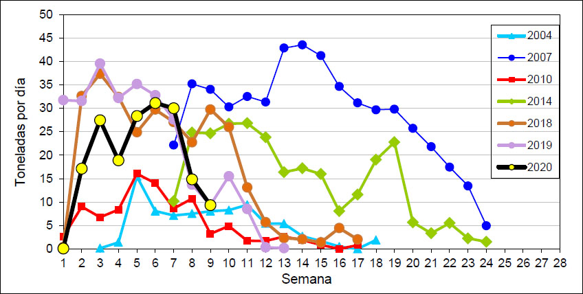 Fue a partir de la semana 8 que la inquietud empezó a ganar terreno en el sector. Se pasó a un promedio de entre 9 y 15 toneladas/día. La caída de los rendimientos refleja el agotamiento del SDV, según consideran los investigadores del Inidep.
