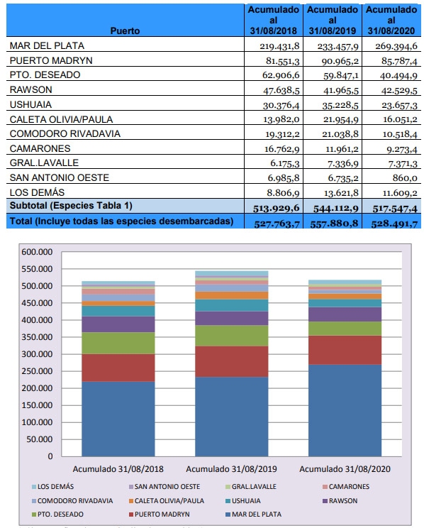 De todas maneras, por influencia principalmente de calamar, Mar del Plata logró sostener volumen. Hasta el pasado 31 de agosto había recibido 269.394 toneladas, contra las 233.457 y las 219.431 toneladas de los mismos períodos de 2019 y 2018 respectivamente.