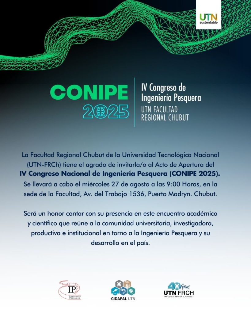 Puerto Madryn será sede del IV Congreso Nacional de Ingeniería Pesquera (CONIPE 2025), que se realizará del 27 al 29 de agosto en la Facultad Regional Chubut de la Universidad Tecnológica Nacional. La actividad coincide con el 40° aniversario de la UTN en la provincia y busca consolidar un espacio de referencia nacional en materia de innovación y desarrollo para el sector pesquero-acuícola.