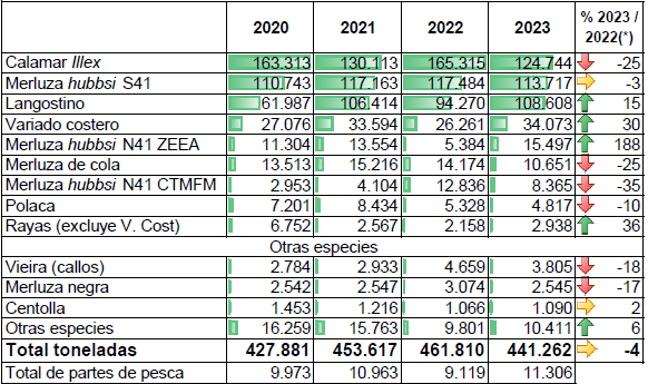 Los números registrados hasta el día martes indican que se llevan descargadas en todos los puertos 441.261,7 toneladas, siendo la provincia de Buenos Aires la que mayor tonelaje registró con 211.646,1; Chubut 142.749,3 toneladas; Santa Cruz 63.209,7 toneladas; Tierra del Fuego 19.969,8 toneladas; Río Negro 3.686,9.