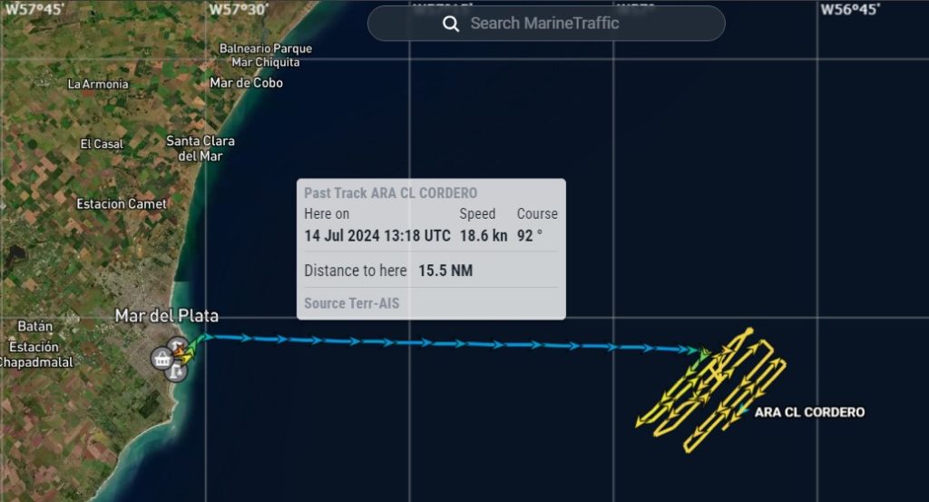 La Armada de la República Argentina cuya función como miembro SAR (Ley 22.445), comprometida en la búsqueda y rescate, contribuyendo a preservar la vida humana en el mar, ayer por la mañana movilizó desde la BNMDP a la zona SAR Proa al Sol II (REY035239) el patrullero oceánico P-54 ARA Contralmirante Cordero que navegó rápidamente a la zona (21 nudos) para comenzar a realizar patrones de búsqueda como se desprende de su derrotero, a los efectos de encontrar los cuerpos de los dos tripulantes aún desaparecidos.